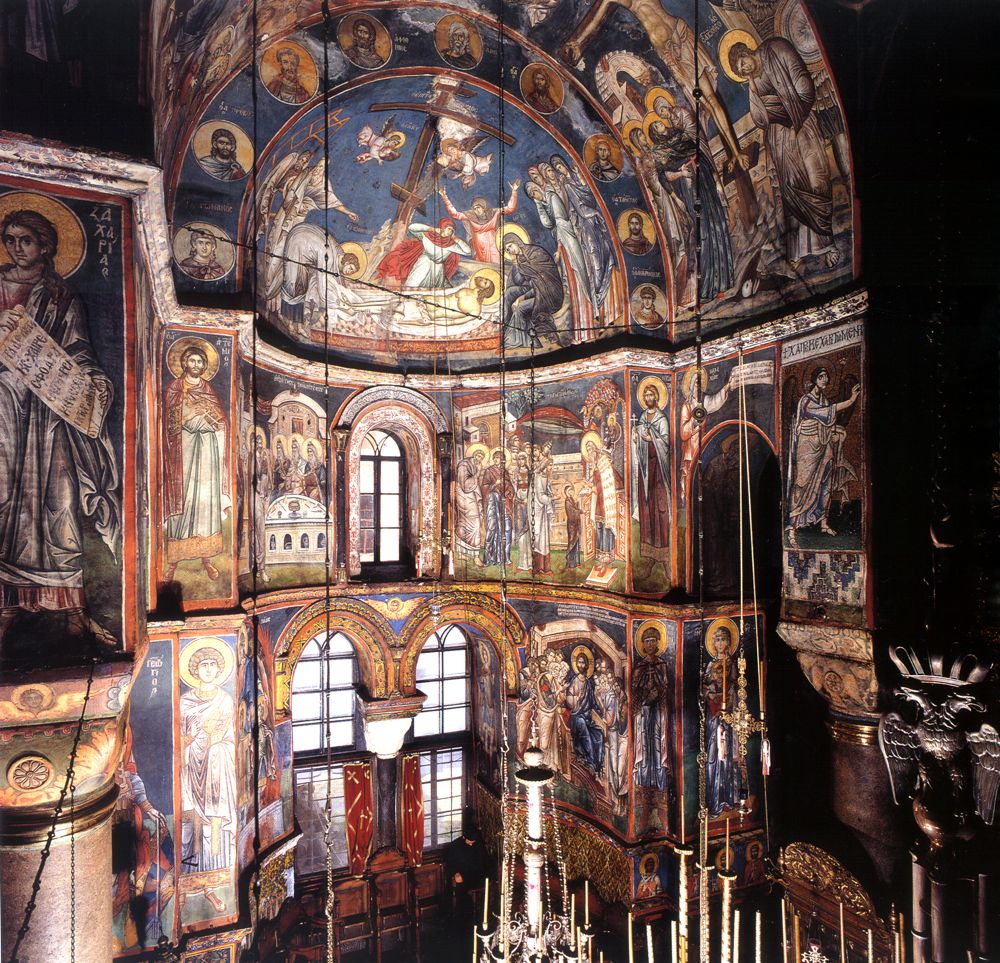 This, the main body of the katholikon, preserves for us all the grandeur of Byzantine taste: a magnificent floor, porphyry columns, frescos (see the lite) and mosaics, a carved and gilt wooden iconostasis, innumerable silver and gilt hanging lamps and silver candelabra.