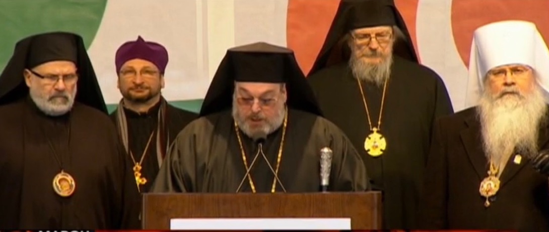 Metropolitan Tikhon and Orthodox hierarchs and clergy on the stage during the pre-March rally. Metropolitan Tikhon and Orthodox hierarchs and clergy on the stage during the pre-March rally.