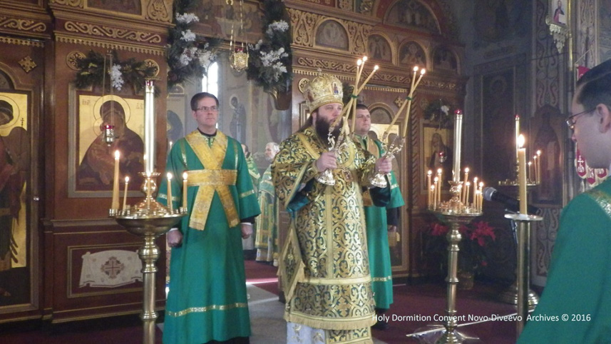 Before the beginning of the Liturgy on Friday, January 15, Archpriest Alexander Fedorowski performed the blessing of the water with the singing of the akathist to Ven. Seraphim. He then came out to greet His Grace, Bishop Nicholas of Manhattan, alongside the other clergy of Holy Dormition Convent Novo-Diveevo in Nanuet NY: Archpriests Mark Burachek, Yaroslav Belikow, and George Zelenin, Hieromonk Photius (Oulanov), Archdeacon Serge Arlievsky, and Hieromonk Panteleimon (Jigalin), as well as Deacon Alexey Pnev (cleric of the Nativity of the Mother of God Church at the New Kursk Root Hermitage in Mahopac, NY).