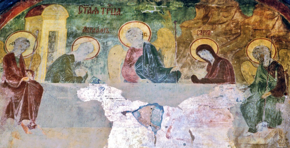 According to the Third Novgorod chronicle, soon after the completion of construction, "icon painters from Tsargrad (Constantinople)" painted Christ with his hand raised in blessing (probably an image of the Pantocrator in the central dome) and other representations of the Savior. Fragments of the 11th-century work, including full-length paintings of Emperor Constantine and Elena, have been uncovered, as well as early 12th-century frescoes.