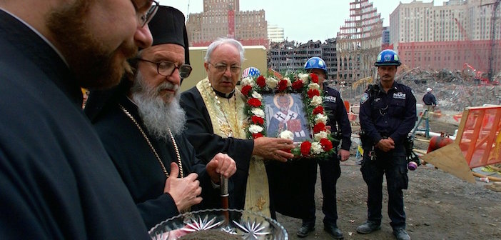 Fr. John wasn’t in the church on Tuesday morning, September 11, when the attack occurred. The church was crushed from falling debris, making it the only house of worship destroyed on 9/11. Shortly after the terrorist attacks, he managed to enter the condemned space and collect what ws left of the church, including part of the wooden kouvouklion, or funeral bier that is used in Greek Orthodox Churches during Good Friday services to commemorate the funeral procession of Jesus Christ.