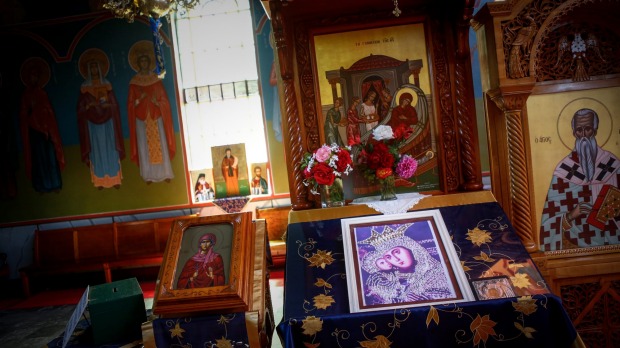 Inside the Byzantine walls of Red Hill's Greek Orthodox Church is a framed image of the Virgin Mary. She wears a white cloak with gold lace and holds Jesus to her right cheek.