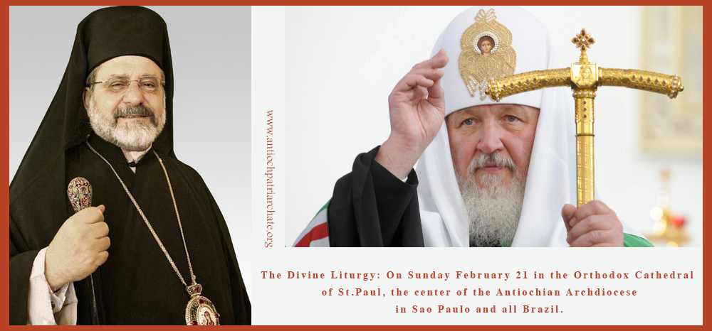 The Antiochian Orthodox Church will receive in Sao Paulo, on behalf of His Beatitude John X the Patriarch of Antioch and all the East, the Patriarch of Moscow and all Russia, Kyril, who will celebrate the Divine Liturgy on Sunday February 21 in the Orthodox Cathedral of St. Paul, the center of the Antiochian Archdiocese in Sao Paulo and all Brazil, whose shepherd is His Eminence Archbishop Damaskinos (Mansour).
