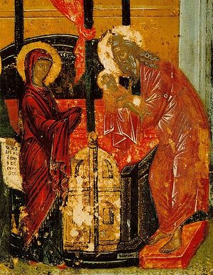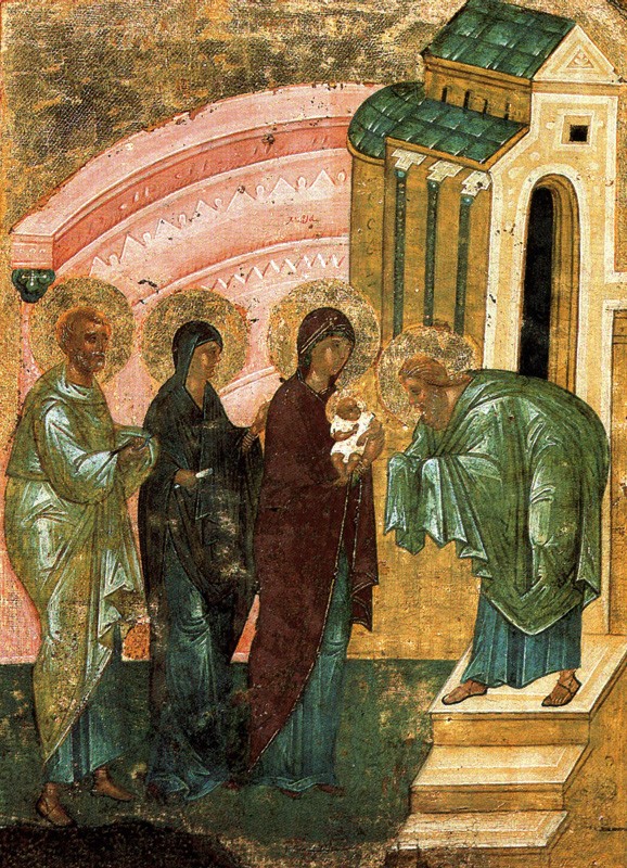 On the fortieth day after the Birth of the Infant God, yet another meeting took place—the Old Testament Church and the New Testament Church. The entire Gospel passage is penetrated with the motif of exact fulfillment of the law of Moses: the forty-day period of purification prescribed in the book of Leviticus (cf. 12:2-4), the dedication of the firstborn son to God (cf. Num. 3:13), and that firstborn son’s symbolic redemption (Ex. 13:13). Nevertheless, it is easy to see that the spiritual center of the event described is completely transferred into New Testament history. Now (Lk. 2:29) means that the time awaited by many generations of the coming of the Messiah has arrived. Holy righteous Simeon speaks of the departure from this world (the verb depart in the Greek and Slavonic texts is in the present tense). The elder Simeon’s inspired speech is filled with praise and thanksgiving to God that the time of promise is now fulfilled. According to patristic tradition, the holy Prophet Zacharias, father of St. John the Baptist, placed the Holy Virgin who came according to the law to fulfill the rite not in the place designated for women there for purification, but in the place designated for virgins (women who had husbands were not allowed to stand there). And when the scribes and Pharisees expressed their indignation, Zacharias proclaimed that this Mother remains and will remain a Virgin and pure: “Therefore I have not forbidden this Mother to stand in the place appointed for virgins, because She is higher than all virgins.”