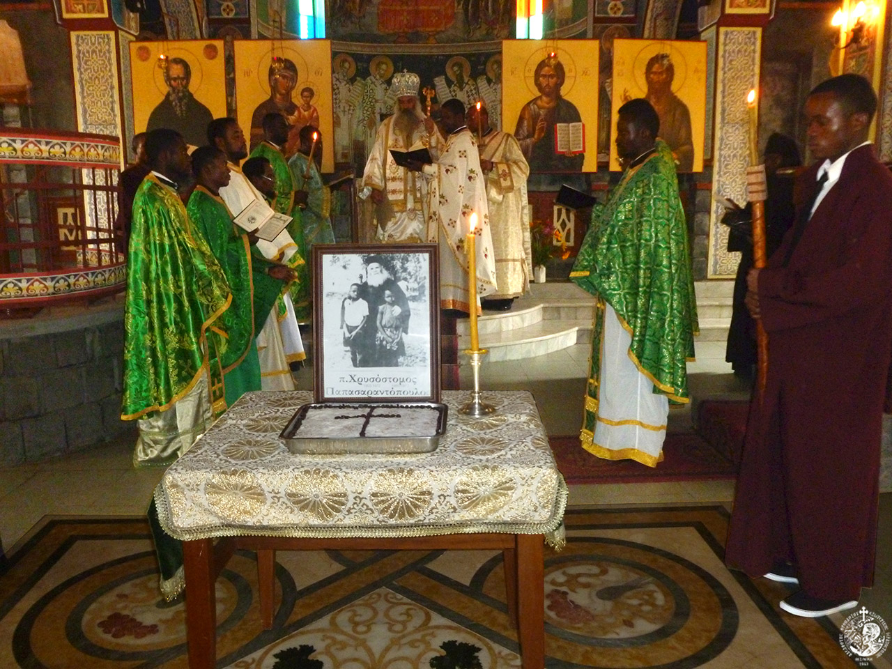 The holy duty of respect to Fr. Chrysostomos’ memory was also paid out by His Eminence Nikiphoros of Kinshasa. On Saturday, December 27, he celebrated his official memorial service at St. Athanasios the Athonite church, in devout concentration, together with many priests and deacons of the holy diocese and with the participation of all the Orthodox students and many other invitees. Afterwards, in the Orthodox University hall followed the civil ceremony in his memory, in which spoke many students and priests, presenting Fr. Chrysostomos’ holy life and missionary work. Among others spoke Fr. Gerasimos from Kananga, who knew Fr. Chrysostomos in person and brought with him a piece of his sanctified relics.