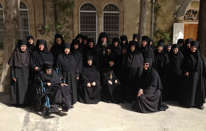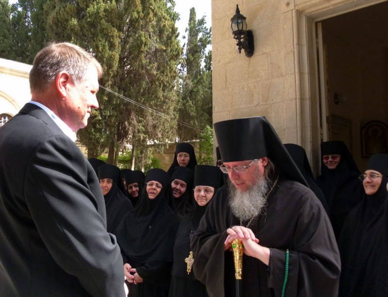 On Wednesday, March 9, 2016, Archimandrite Roman (Krassovsky), Chief of the Russian Ecclesiastical Mission in Jerusalem, and Abbess Moisseia of Ascension of the Lord Convent on the Mt. of Olives, Jerusalem, along with the nuns, greeted Romanian President Klaus Iohannis at the gates of the convent. President Iohannis is currently on a state visit to Israel.