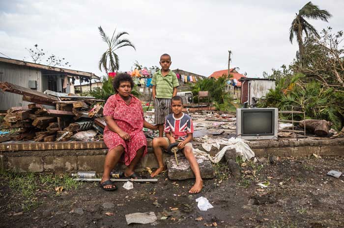 A family in Fiji sits on the brick wall of what use to be their home after winds from the Category 5 Tropical Cyclone Winston together with tsunami-like storm surges left them homeless. IOCC, in cooperation with the Greek Orthodox Mission to Fiji, is responding to the need for reconstruction assistance following the devastating storm. photo: UNICEF/Sokhin
