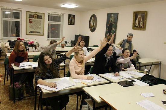 —AM: Yes, on a typical Friday we now have sixty students coming to learn English, and we also have one group each of German and French at the beginner’s level which we want to develop. Our dean, Fr. Alexander, blesses our activities and we are very grateful to him for giving us the chance to use the Sunday School building of his parish.[2]