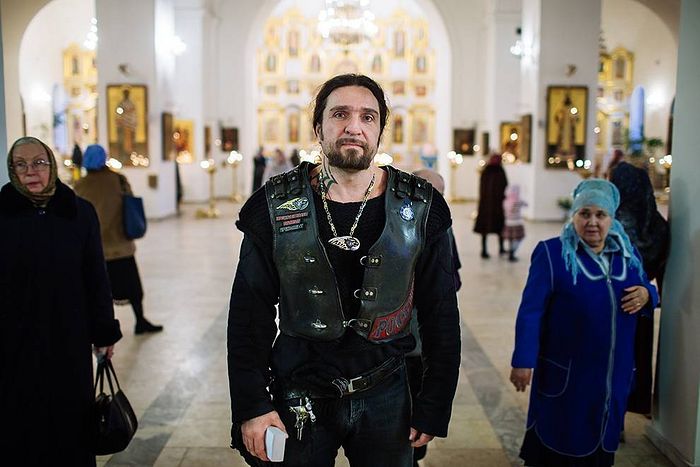 He is wearing the usual outfit – the black fatigues of a motorcycle rider: jeans, leather jacket and boots, and a black woollen cap. Round his neck he wears a thick metal chain with the Night Wolves’ emblem. He always wears a small Orthodox Christian cross hidden behind the black T-shirt.