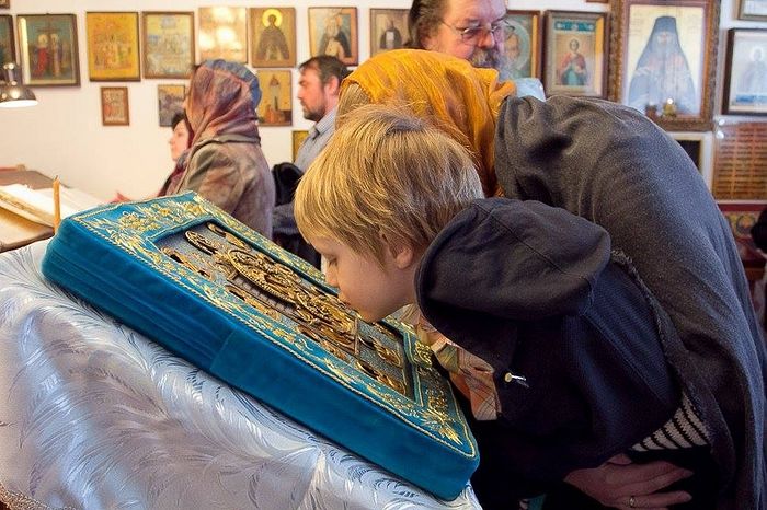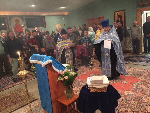 The next morning began with a baptism (the daughter of the parish warden, Mr. Joshua Shaw) before the Kursk Root Icon, followed by Hours and Liturgy. After the Gospel, Fr. Mark preached a sermon about how this particular vitiation of the icon to the parish of the Mother of God had many reasons, but also to lead the faithful into Great Lent. About 100 people attended the Liturgy, and many more came after the Liturgy to venerate and pray before the Kursk Root Icon.