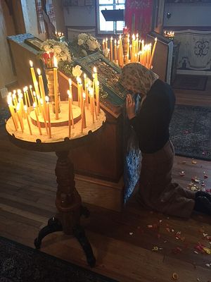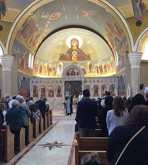 The fifth visitation the Kursk Root Icon was to Holy Trinity Greek Cathedral in downtown Columbia. Although the holy Icon arrived over two hours after their Sunday Liturgy was completed, over 200 faithful stayed in church and waited for the Icon to arrive. The holy Icon was received at the front doors of the church by the rector, Alexander Michael Platanis, and taken into the church and placed on an analogion on the solea. Fr. Michael invited Fr. Mark to give a presentation about the Kursk Root Icon and Fr. Mark spoke about the history of the Icon and her importance to the Russian Church, and relayed some of the miracles connected to this holy Icon of the Mother of God. After the presentation, a Paraklesis was served, while all the faithful came up onto the solea to venerate the Icon.