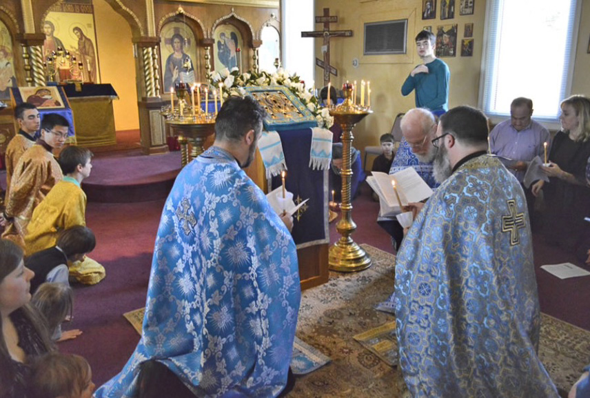 On the morning of Saturday, February 27, the Kursk Root Icon of the Mother of God made her eighth visitation in the Carolinas. This visit was to Holy Cross OCA Church in High Point, NC. Parish rector Priest Christopher Foley blessed the people with the holy Icon, and the moleben and akathist began. Co-serving with Fr. Christopher was Archpriest Onouphry Keith (pastor emeritus of St. Nicholas Church in Fletcher, NC), and Priest Dragoslav Kosic (rector of St. Basil of Ostrog Serbian Church in Kernersville, NC). Over 200 faithful were in attendance and, after the service, everyone came up to venerate and pray before the holy Icon.