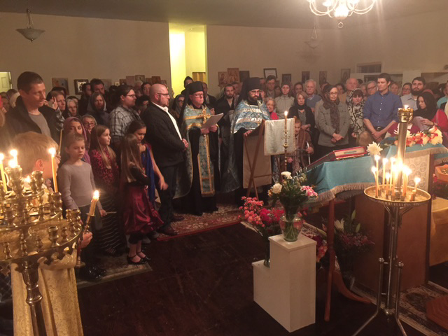 In the early afternoon on February 27, the Kursk Root Icon made her ninth and final stop in the Carolinas at the Reigning Mother of God parish in Charlotte, NC. About 75 of the faithful were waiting outside to greet the holy Icon as she arrived. Parish rector Archpriest Alexander Logunov and Priest Alexander Stepanenko (parish cleric) received the holy Icon and took her into the church, where she was met by His Grace, Eastern American Diocesan vicar Bishop Nicholas of Manhattan, guardian of the Kursk Root Icon. A moleben and akathist were served, and the holy Icon remained in the church through the All-Night Vigil. The next morning, a hierarchical Liturgy was celebrated by Bishop Nicholas, co-served by Fr. Alexander and parish Deacon Ioann Makarov. A festal luncheon was held afterward in celebration of the 10th anniversary of the founding of the parish.