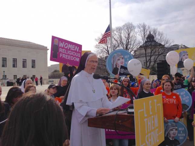 Mother Assumpta, superior of the Dominicans, Mary Mother of the Eucharist in Ann Arbor, Michigan, told rally-goers, "Filling out a piece of paper is not the issue. What concerns the Little Sisters is that the piece of paper demanded by the government triggers the provision of contraceptives and abortifacients to the women in the Little Sisters health plans, making the Little Sisters a vital part of the chain and materially complicit in the provision of services that they find morally objectionable. Complicity with sin is sin in itself. And the government cannot make this otherwise."