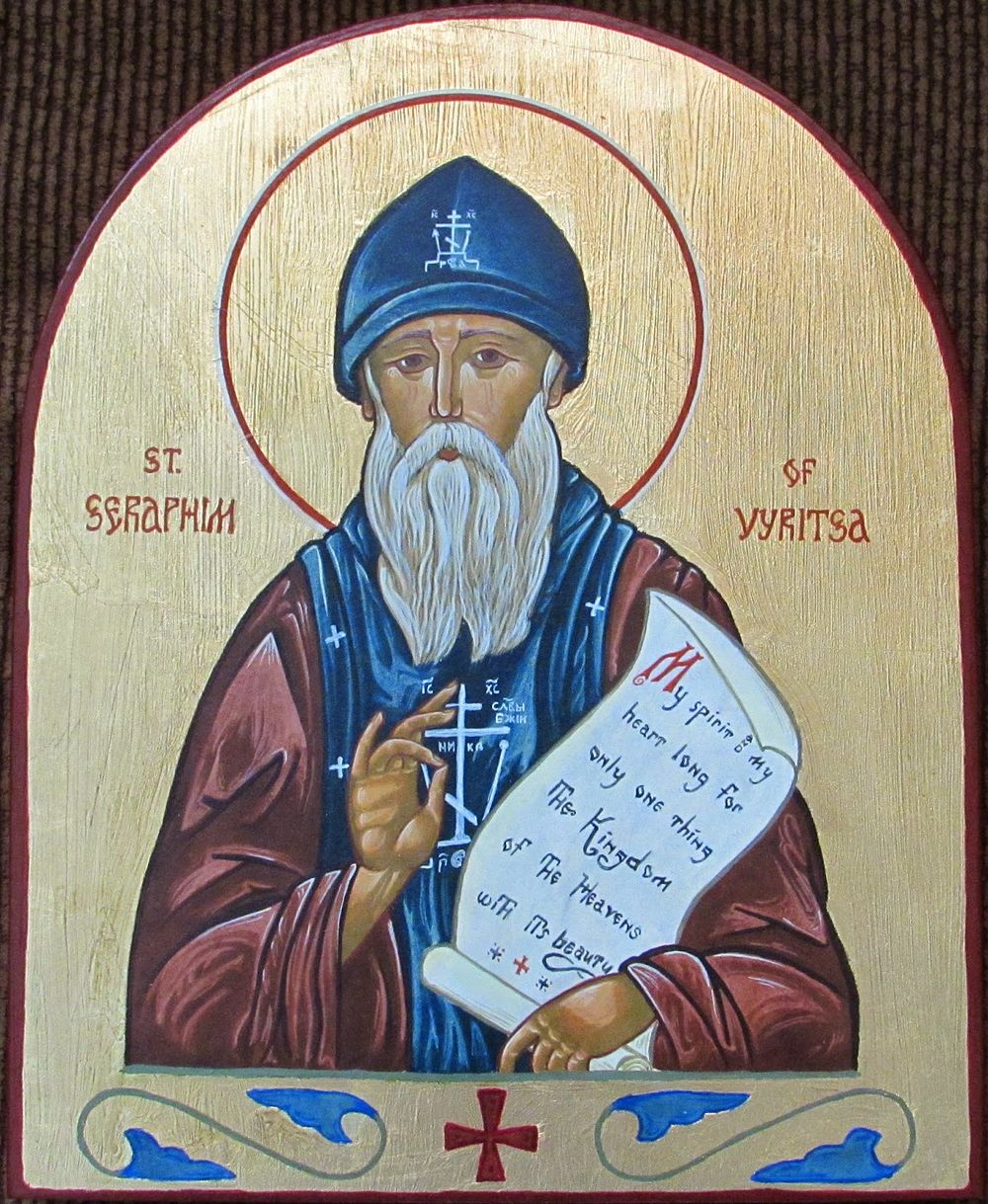 O divinely blessed and most-merciful father Seraphim! We behold thee, even after thy death, truly alive and with faith we fall down before thee crying, forget not thy paupers to the end, but look with mercy on us thy spiritual flock, and shepherd us, O good pastor, with thy prayers, which are well-pleasing to God. Ask for us of the Lord time for repentance and the correction of our sinful ways, since thou dost clearly see all our spiritual infirmities; for we have no works of faith for salvation, we have no zeal for a truly God-pleasing life, our minds are captive to death-bearing passions, and we defile our hearts with foul lusts. We carelessly disregard the very blessed things we claim to await and hope for, thereby destroying the temple of our souls. O holy father, stretch forth thy hands in prayer to the Lord and entreat the Savior to touch the human race and our stony hearts with His grace, wash us with tears of repentance, renew us in faith, strengthen us in virtue, and give unto us everything beneficial for our salvation. Let us not be put to shame for we have put our hope in thee, together with our Lord God and the Most-Pure Theotokos; be unto us a sure and quick helper, a comforter in afflictions, and a protector in the various circumstances of life. Make us worthy, O holy Seraphim, by thy prayers of the delights of the Heavenly Kingdom, where all the saints unceasingly praise and glorify the All-Immaculate and Greatly Marvelous Name of the Father, and of the Son, and of the Holy Spirit, now and ever, and unto ages of ages. Amen.