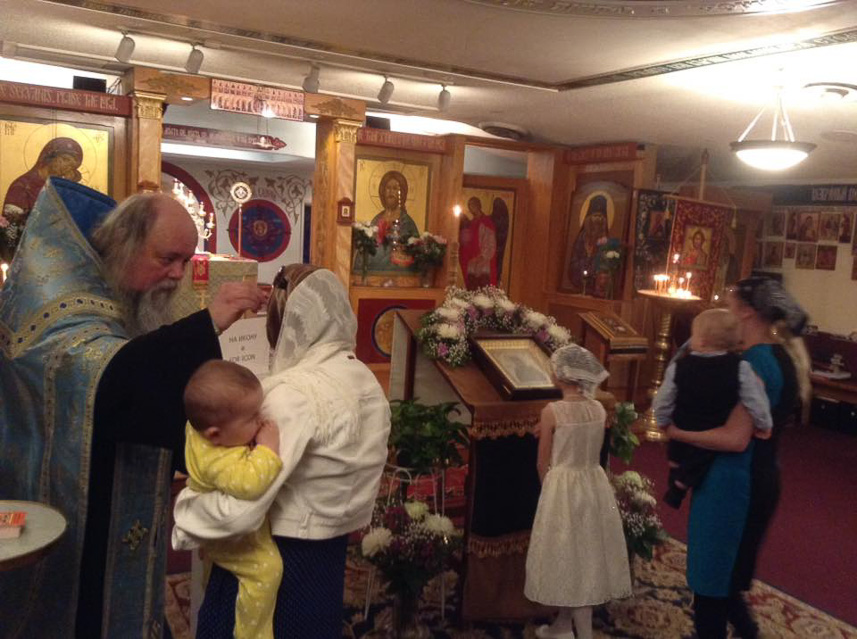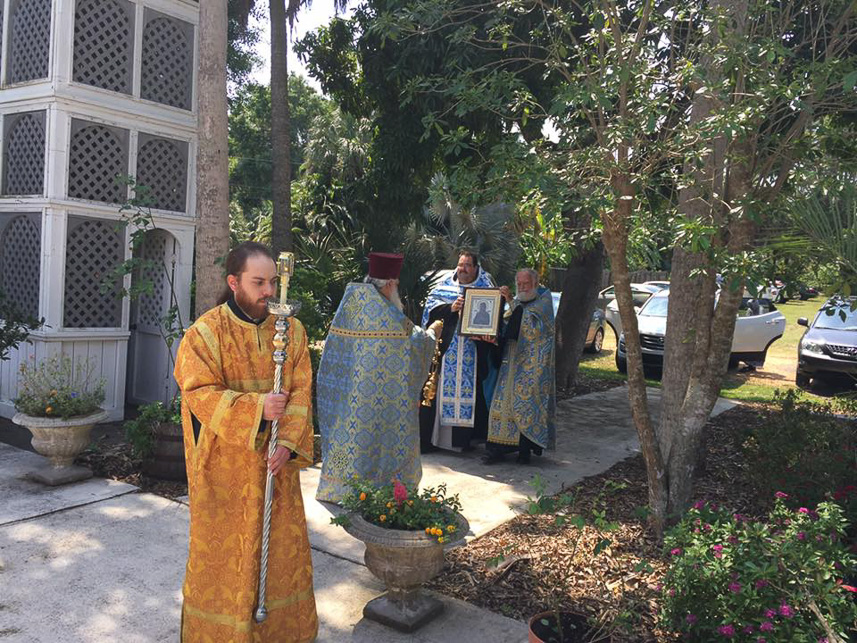 In Palm Coast, the Icon was greeted at the airport terminal by the rector of nearby St. Nicholas Church, Priest Vladimir Kaydanov, who proceeded with the Icon and those accompanying her to the church. There, the faithful gathered for a moleben and akathist before the myrrh-streaming Icon. At all of the parishes, the priests anointed the faithful with holy myrrh from the Icon.