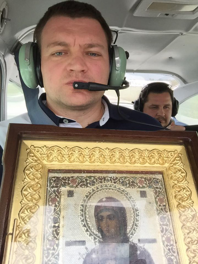 On Tuesday, April 12, the Icon traveled by air from Tampa to Jacksonville and Palm Coast. Accompanying Fr. Andrey in the aerial procession was the Icon’s guardian, Sergey Fomin. Throughout the flight, the Icon streamed myrrh abundantly.