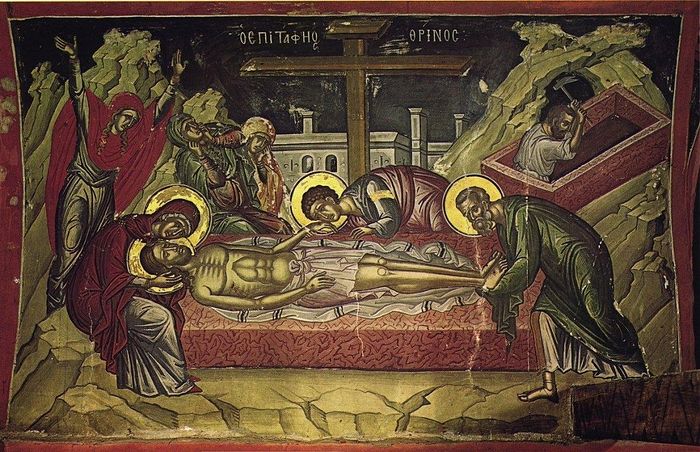 At one point in the reading, the Body of Christ is removed the cross, wrapped in a white cloth and is brought into the sanctuary. Following the reading, the priest carries the icon of the Epitaphios through the church and places it in the Sephulchre (the kouvouklion), which has been decorated with flowers.