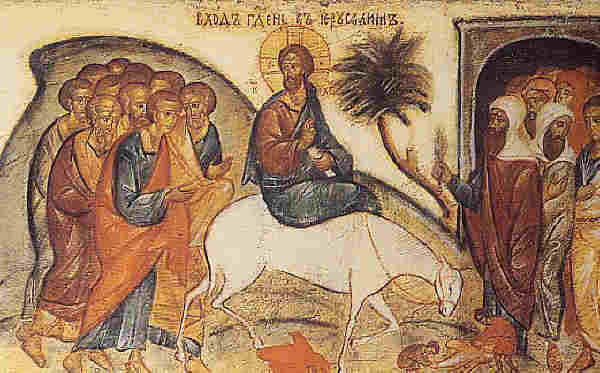 So the King who had raised Lazarus from the dead entered Jerusalem sitting upon an ass. Everyone, children, men, old people, immediately spread their garments in the way. They took palm-branches, which are symbols of victory, and went to meet Him as the life-giver and victor over death. They fell at His feet and escorted Him in procession, singing together, not just outside but also inside the precincts of the Temple, Hosanna to the Son of David, Hosanna in the highest (Mt. 21:9). “Hosanna” is a song of praise directed to God, which means, “Save us.” The additional words “in the highest” show that He is not only praised on earth, nor only by men, but also by the heavenly angels on high.