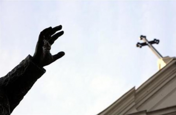 (Reuters/Fatih Saribas)The hand of the statue of Pope Benedict XV is seen under the cross of the St. Esprit Cathedral in Istanbul.