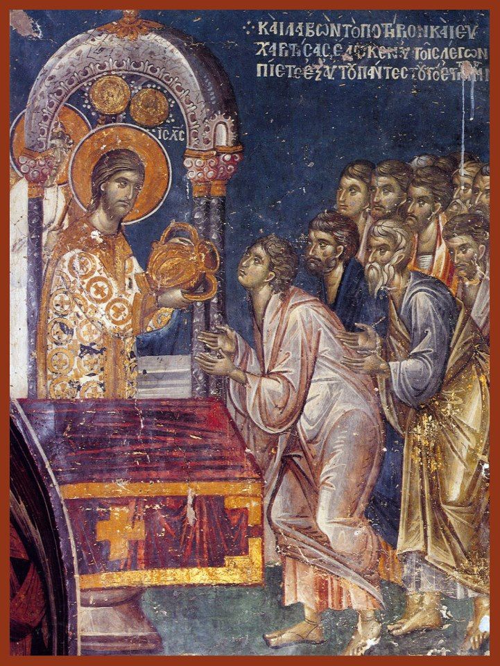 But He is also within us in another way by means of our partaking in the oblation of bloodless offerings, which we celebrate in the churches, having received from Him the saving pattern of the rite, as the blessed Evangelist plainly shows us in the passage which has just been read. For He tells us that He took a cup, and gave thanks, and said, Take this, and divide it with one another. Now by His giving thanks, by which is meant His speaking to God the Father in the manner of prayer, He signified to us that He, so to speak, shares and takes part in His good pleasure in granting us the life-giving blessing which was then bestowed upon us: for every grace, and every perfect gift comes to us from the Father by the Son in the Holy Spirit. And this act then was a pattern for our use of the prayer which ought to be offered, whenever the grace of the mystical and life-giving oblation is about to be spread before Him by us: and so accordingly we are wont to do. For first offering up our thanksgivings, and joining in our praises to God the Father both the Son and the Holy Spirit, we so draw near to the holy tables, believing that we receive life and blessing both spiritually and corporeally: for we receive in us the Word of the Father, Who for our sakes became man, and Who is Life, and the Giver of life.