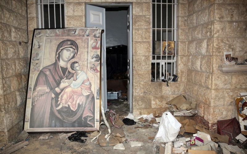 A painting of Mary and the Christ Child is is seen in 2014 at the damaged St Thecla Orthodox monastery in the predominantly Christian town of Maaloula, Syria (CNS photo/Youssef Badawi, EPA)