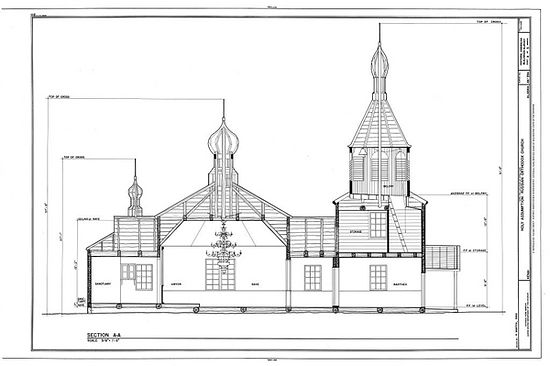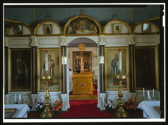 Father Yaroshevich undertook the original construction of the church in 1894 to replace an older church raised in 1849 by Father Nikolai Militov, the original priest of the Kenai Parish. When Yaroshevich arrived on the Gulf of Kenai in 1893, this older church was on the verge of structural collapse. He applied to the Holy Synod, the Orthodox Church’s governing body, for funds and was granted $400, no trifling sum at the time. Like most Russian buildings in the colony, it was built of hewn spruce logs, joined at the corners with dovetail notches. It was built in the Pskov pattern, a shape designed to be reminiscent of a ship, with the inherent metaphor of the church being a ship to carry the souls of the faithful over stormy seas. The original structure measured about 23 by 44 feet, a size likely determined by the length of the logs available in the area. Its original onion dome was tipped with the three-bar Orthodox cross. The lower angled bar represents the angled stub that Jesus’ feet were nailed to, and the topmost stands for the sign the Romans supposedly hung above his head that read Jesus of Nazareth, King of the Jews. A two-story belfry was added to the north side in 1900, topped with another dome.