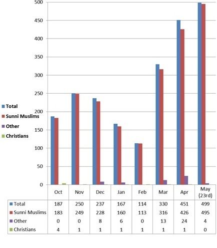 Of the 499 admitted in May, 495 are Sunni Muslims and the remaining four are described simply as “Moslem” in State Department Refugee Processing Center data.