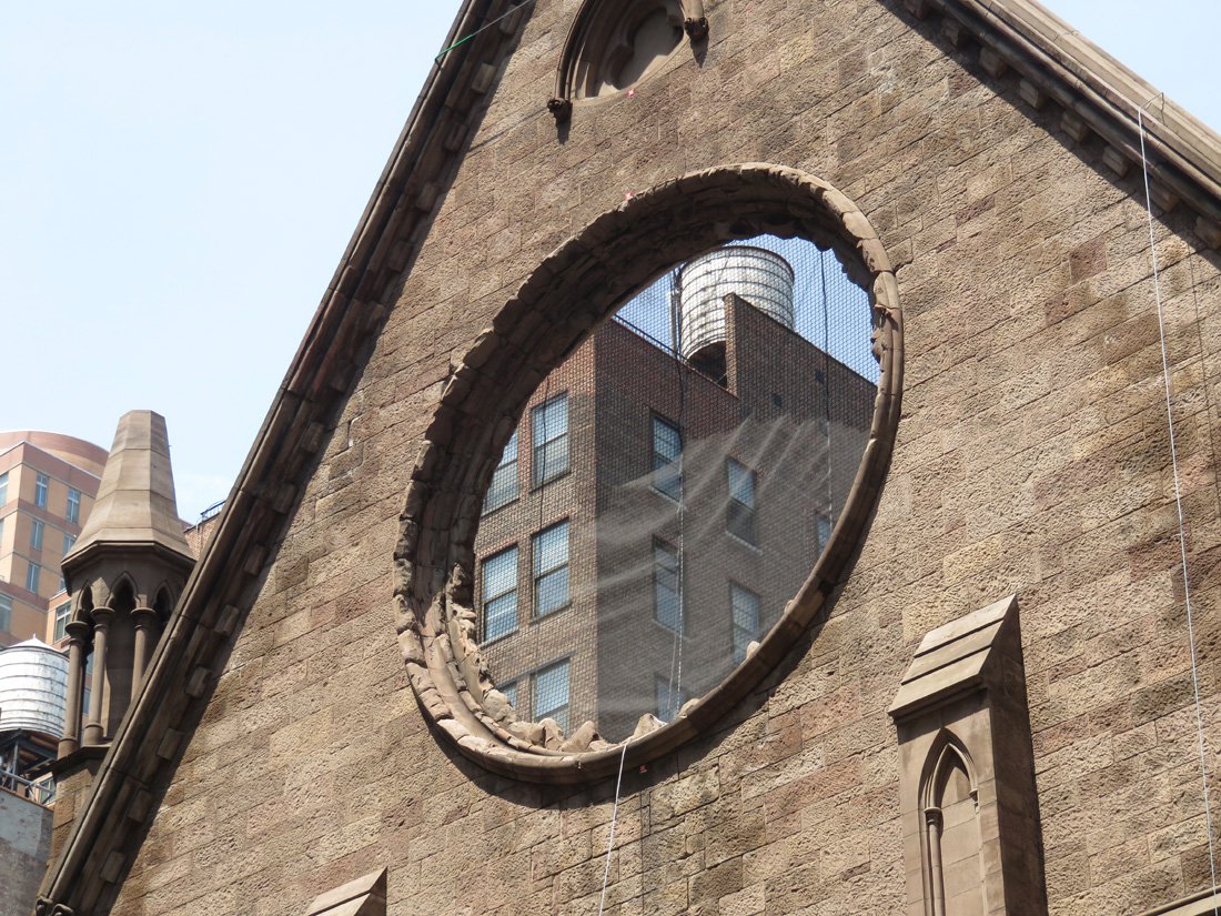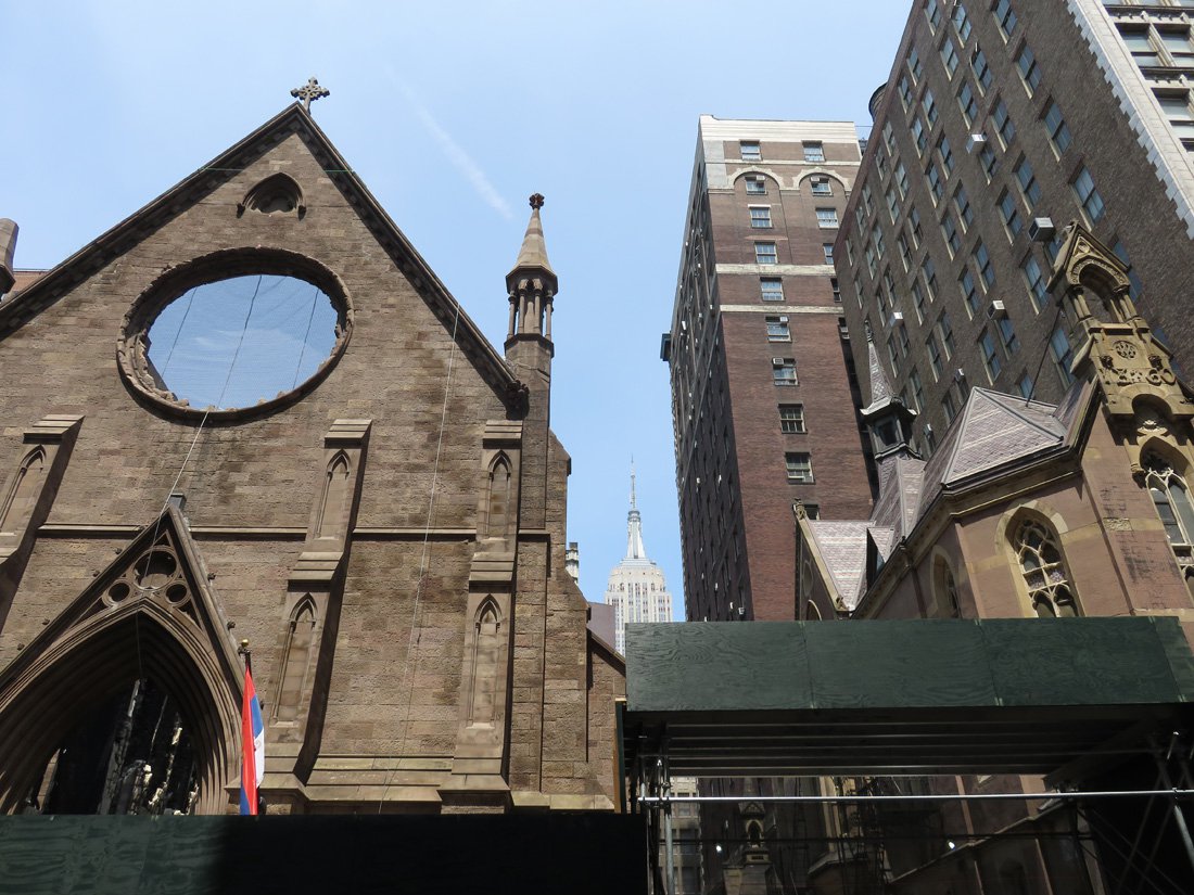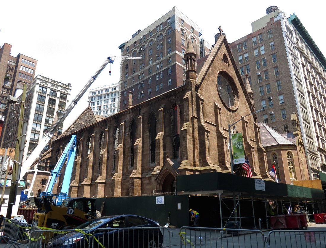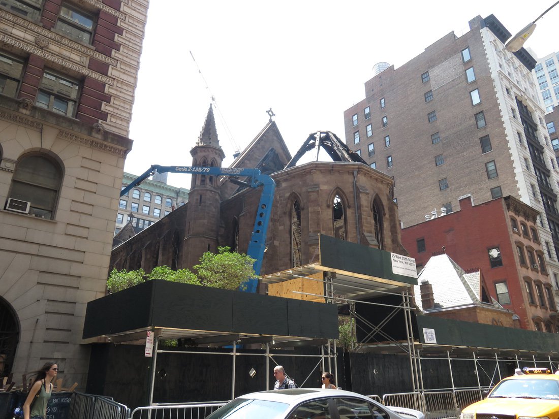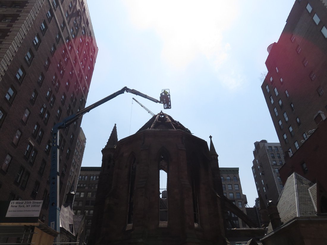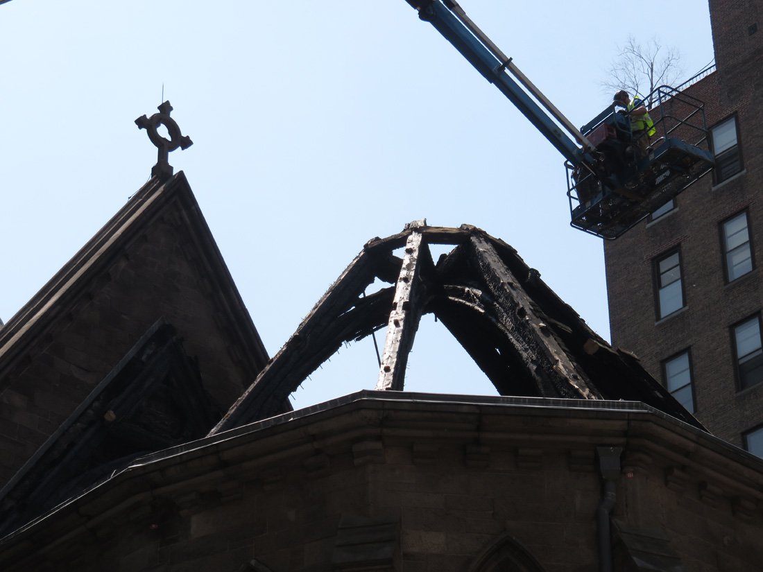 Only the charred rafters above the apse (the semi-circular, rear portion facing West 26th Street) remain at the moment.