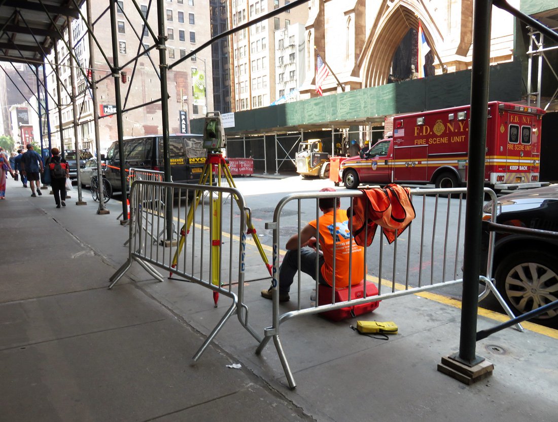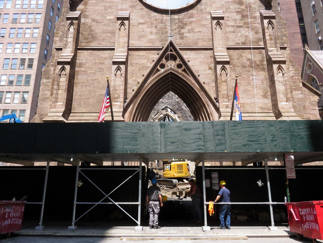 On May 24, cathedral officials posted a press release regarding the status of the structure. Our following-day site visit revealed additional details. The FDNY is currently investigating the cause of the fire, which was deemed “suspicious” by fire officials the day after the blaze. Engineers from Staten Island-based Rogers Surveying PLLC are also at the site, monitoring the ruin for ground movement and other signs that may indicate danger.