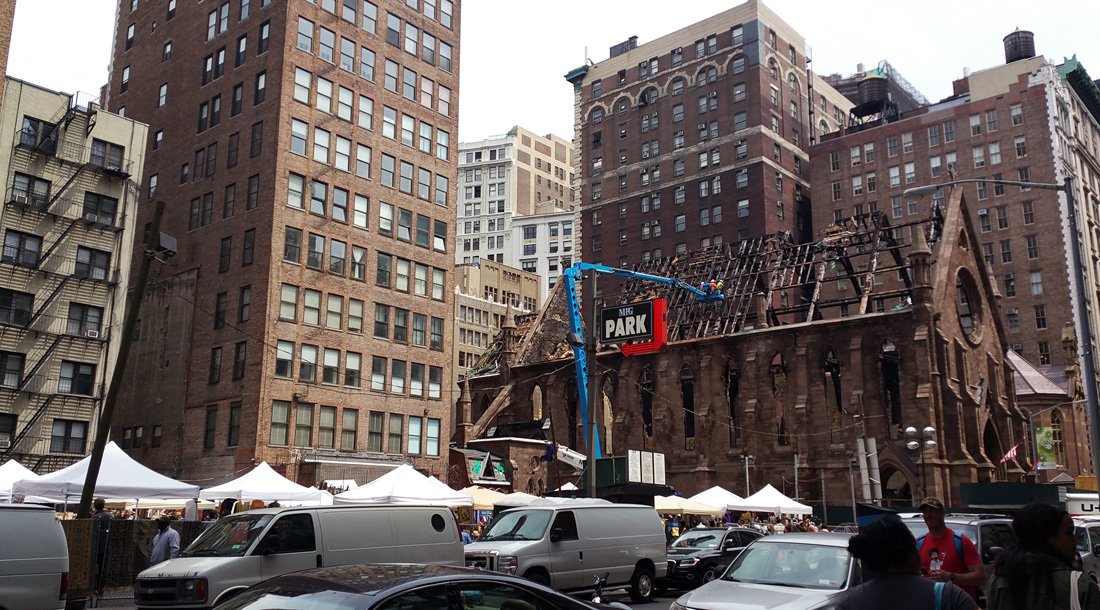 The businesses along West 25th are open once again. Even the large parking lot immediately west of the church, which was used for staging by the emergency crews during and shortly after the fire (and a portion of which is still used for that purpose), is open for business once again, used for parking during the week and hosting the Chelsea Flea Market during weekends between 6:30 a.m. and 5:00 p.m.