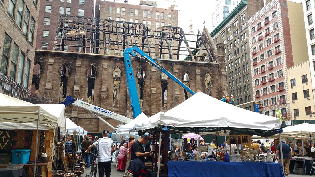 The cathedral on May 14, with the roof beams still in place. The Chelsea Flea Market is in the foreground.