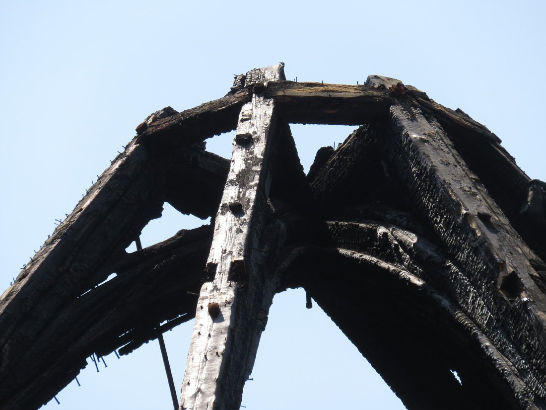 The wooden rafters of the central nave, which once made up one of the city’s largest hammerbeam roofs, collapsed on their own prior to their scheduled removal by the fire department.