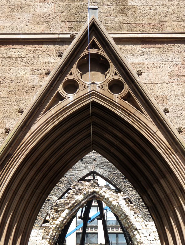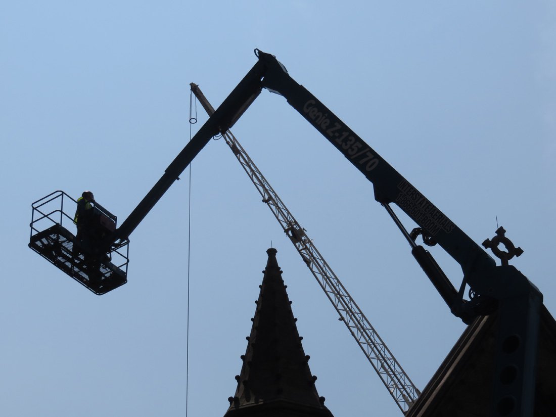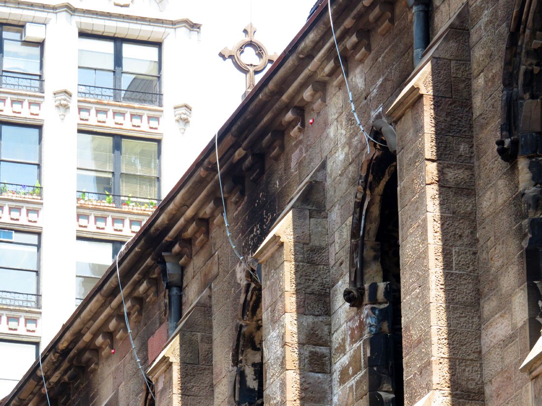 The building’s most fragile point is the pinnacle above the rose window above the main entrance. Prior to the fire, circular tracery added rigidity to the stone façade, laterally strengthened by the wooden beams of the roof. Now, the tracery is gone along with the roof, leaving the 28th Street pinnacle supported only by the sloping walls on either side of the window, which sits well above the four buttresses that support the front façade.