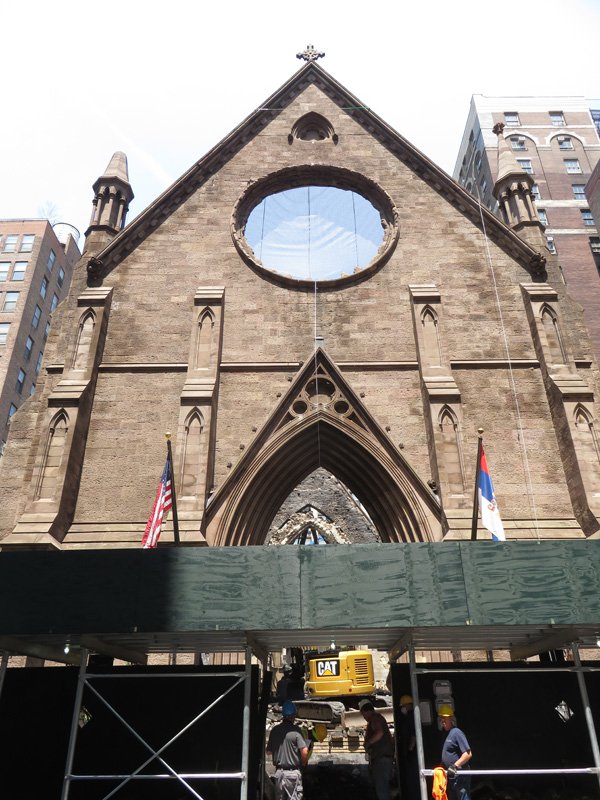 As this month got underway, we brought you the unfortunate news regarding the landmark Serbian Orthodox Cathedral of St. Sava at 15 West 25th Street, designed by Richard Upjohn, the architect of the Trinity Church in Lower Manhattan. The 1855 building, which was the city’s only house of prayer servicing the Serbian Orthodox community, was reduced to a charred stone shell on the evening of May 1, just hours after the Orthodox Easter celebration. While the church is collecting donations for reconstruction, the authorities are investigating the fenced-off site for the cause of the conflagration, while engineers keep an eye on the ruined building’s stability. The building is a New York City landmark and is listed on the U.S. National Register of Historic Places. Although the city’s laws protect the building from further demolition, the stone shell may be torn down if ultimately deemed dangerously unstable. Fortunately, the walls appear to be structurally sound for the time being, though serious reinforcement work would be permitted only after the investigations are complete.