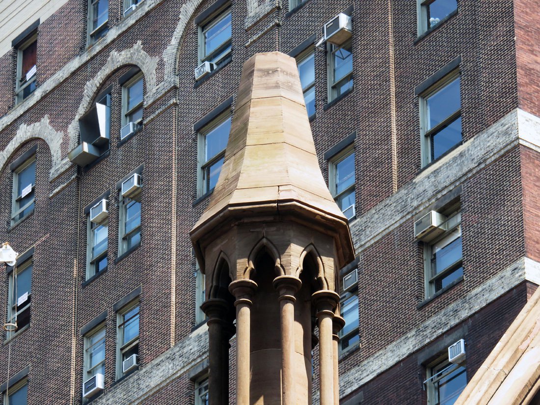 The only notable portion of the stone exterior that was destroyed is the tip of the western turret at West 25th Street, which was apparently knocked from its perch during fire-fighting efforts.