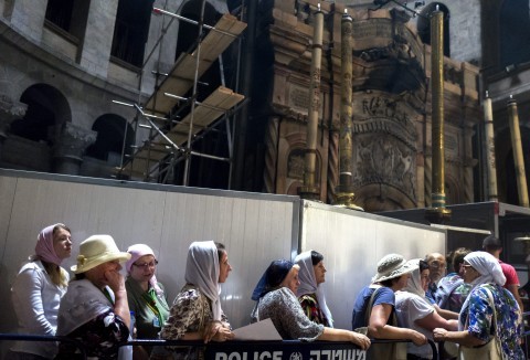 Christian pilgrims stand in line near the rotunda as they await entrance into the Tomb of Jesus in the Church of the Holy Sepulchre. (Jim Hollander/EPA)