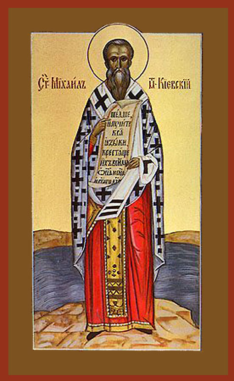 Saint Michael the first Metropolitan of Kiev, according to the Joakimov chronicle, was a Syrian by birth, but according to other chronicles, he was a Bulgarian or Serb. In the year 989, he arrived at Korsun with other clergy for holy Prince Vladimir (July 15), not long after Vladimir’s Baptism (988).