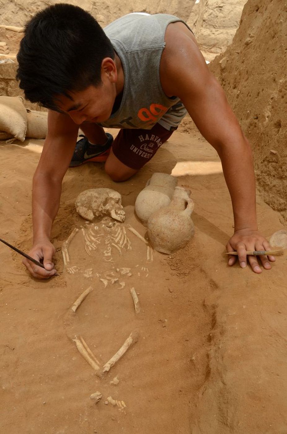 A student excavates a 10th-9th century BC burial in the excavation of the Philistine cemetery by the Leon Levy Expedition to Ashkelon. (Melissa Aja /Leon Levy Expedition)