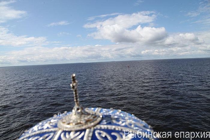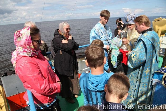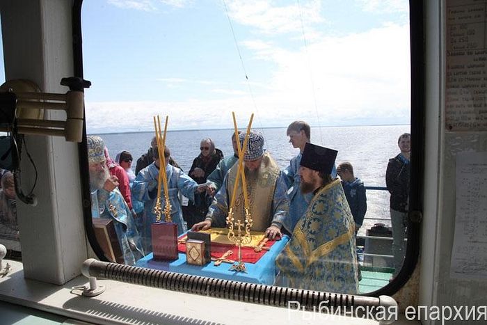 The Divine Liturgy on that commemoration day was celebrated by Bishop Benjamin of Rybinsk and Danilov with Archpriest Vasily Denisov, Priest John Perevezentsev and clergy of the Diocese of Rybinsk concelebrating. The service was performed on a ship over the site where the convent was located.