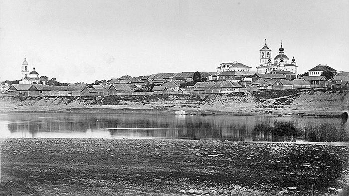 The now flooded town of Mologa was situated thirty-two kilometers (about twenty miles) from Rybinsk and 120 kilometers (around seventy-four and a half miles) from Yaroslavl—at the confluence of the Mologa river with the Volga river. On September 14, 1935, the Council of People’s Commissars of USSR and the Central Committee of the All-Union Communist Party (of Bolsheviks) decreed that building of the Rybinsk and Uglich water-engineering systems commence. The residents were resettled, and by 1947 the territory of the town was completely flooded. The St. Athanasius Convent (whose main relic was the wonderworking Tikhvin icon of the Mother of God) as well as four churches were submerged.