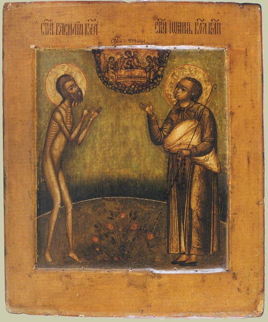 Blessed John, Fool-for-Christ, Wonderworker of Moscow, was born on the outskirts of Vologda. In his youth he toiled at a saltworks, where he was a water-carrier. The saint combined strict fasting and prayer with his heavy work. Later he moved on to Rostov, where he began his exploit of holy foolishness for the sake of Christ. He wore chains with heavy iron crosses, and on his head was a heavy iron cap, for which they called him “John Big-Cap”. In Moscow he went barefoot and almost naked in even the most severe frost, and he foretold the great misfortunes for Russia, the Time of Troubles and the incursion of the Poles, saying that “in Moscow will be many visible and invisible devils.”