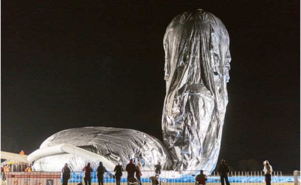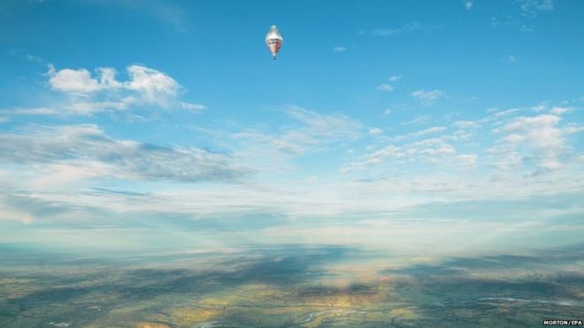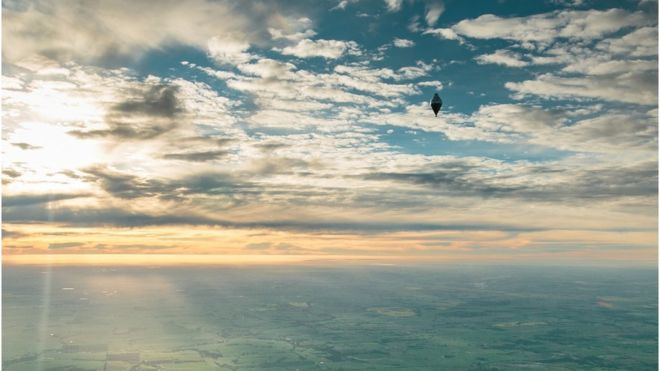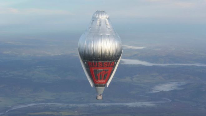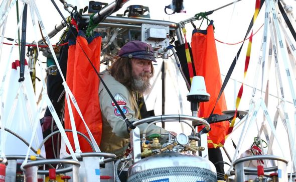 The adventurer is suspended from a 56m (184ft) helium and hot-air balloon, in a 2m-cubed carbon-fibre box.