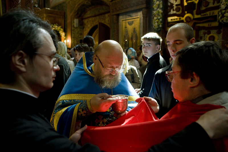 How ought we to prepare ourselves for Holy Communion, that fellowship with Christ would serve not for our condemnation, but salvation? Those who desire to live the married life are called to sanctify their union by the Mystery of Marriage, of which we will speak later. Preparing ourselves to commune of the Holy Mysteries of Christ, we fulfill the Church’s ordinance concerning fasting on Wednesday and Friday. For communicants, those who prepare [говеет] themselves (“говение”—it’s a good Russian word meaning preparation for Divine Liturgy and participation in it), there is prescribed a short Eucharistic fast. As a rule, it pertains to the evening of the day before Communion, and in the morning we come to Liturgy on a strictly empty stomach: and there was evening and there was morning, one day (Gen. 1:5).