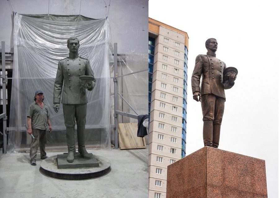 In his studio, sculptor Konstantin Zinich puts the finishing touches on his sculpture of Tsesarevich Nicholas Alexandrovich (left); the finished monument now stands on Cossack Square in the Russian City of Chita (right)