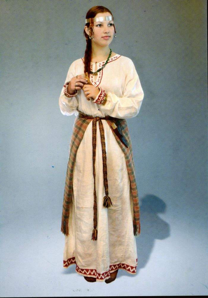 —As opposed to modern dress, ancient folk costumes were very informative and multifunctional, like a business card. Such things as a kin, a tribe, a religion, a profession, and social status were expressed in a costume’s design by means of numerous attributes, signs and symbols. An outfit’s material, style, range of colors, presence or absence of certain elements, ornamentation and decorations all come together to create a full image of its owner. In this sense, studying old Russian costumes enables us to have a better picture of the everyday life of the population of old Russia along with its worldview. The eastern Finnish national dress which was traditional for the Belo Ozero district was given a huge impetus by the Slavic settlers who enriched it with elements characteristic of their culture. The district’s trade links with the Volga river basin and the Baltic contributed to the appearance of new forms of clothing as well as types of adornments, which had an important religious meaning in ancient times, in Belo Ozero. The blending of cultures is most noticeable in formal women’s attire which included a large number of metal adornments, worn in a strict order. The decoration of old Belo Ozero costumes can be regarded as the best achievement of applied art of tenth-eleventh century north Russia. During this period the set of adornments changes, new forms appear and disappear, and attire itself becomes simpler, losing its barbarian grandeur, and pagan elements are supplanted by strong Christian ceremonialism in the dress. The one Russian nation came up to take the place of the Slavic and Ves’ tribes, and blood of various tribes who found their home in the area of Belo Ozero flows in its representatives’ veins.