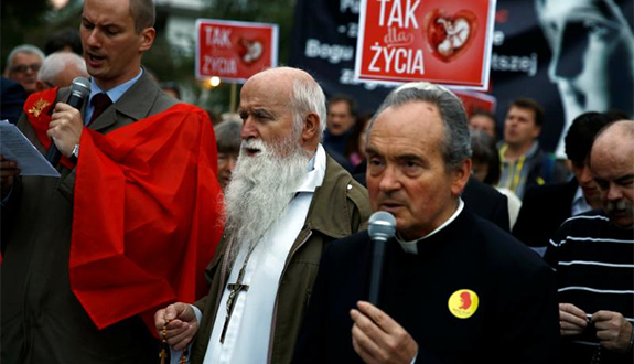 A clergyman and others pray as they take part in Sept. 22 pro-life rally in front of the parliament in Warsaw, Poland. Banners read: "Yes for life." (CNS photyo/Kacper Pempel, Reuters)