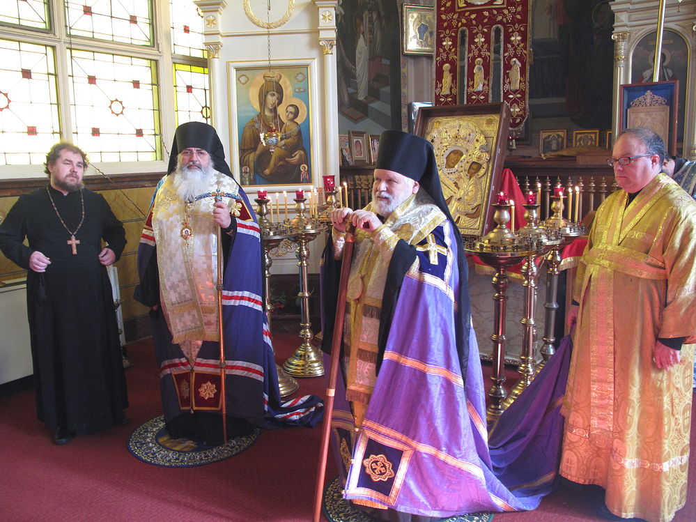 The icon was then brought in procession from the parish hall to the cathedral, at which time Bishops Paul and Mstislav, assisted by Deacons Thomas Keith and Alexander Koranda, celebrated the Akathistos Hymn in the icon’s honor. Also in attendance were Hieromonk Onufrii, who accompanied Bishop Mstislav; Archpriest John Adamcio, cathedral Dean; Archpriest Mykola Bodnarchuk; and Priest Alexei Vassiouchkine.