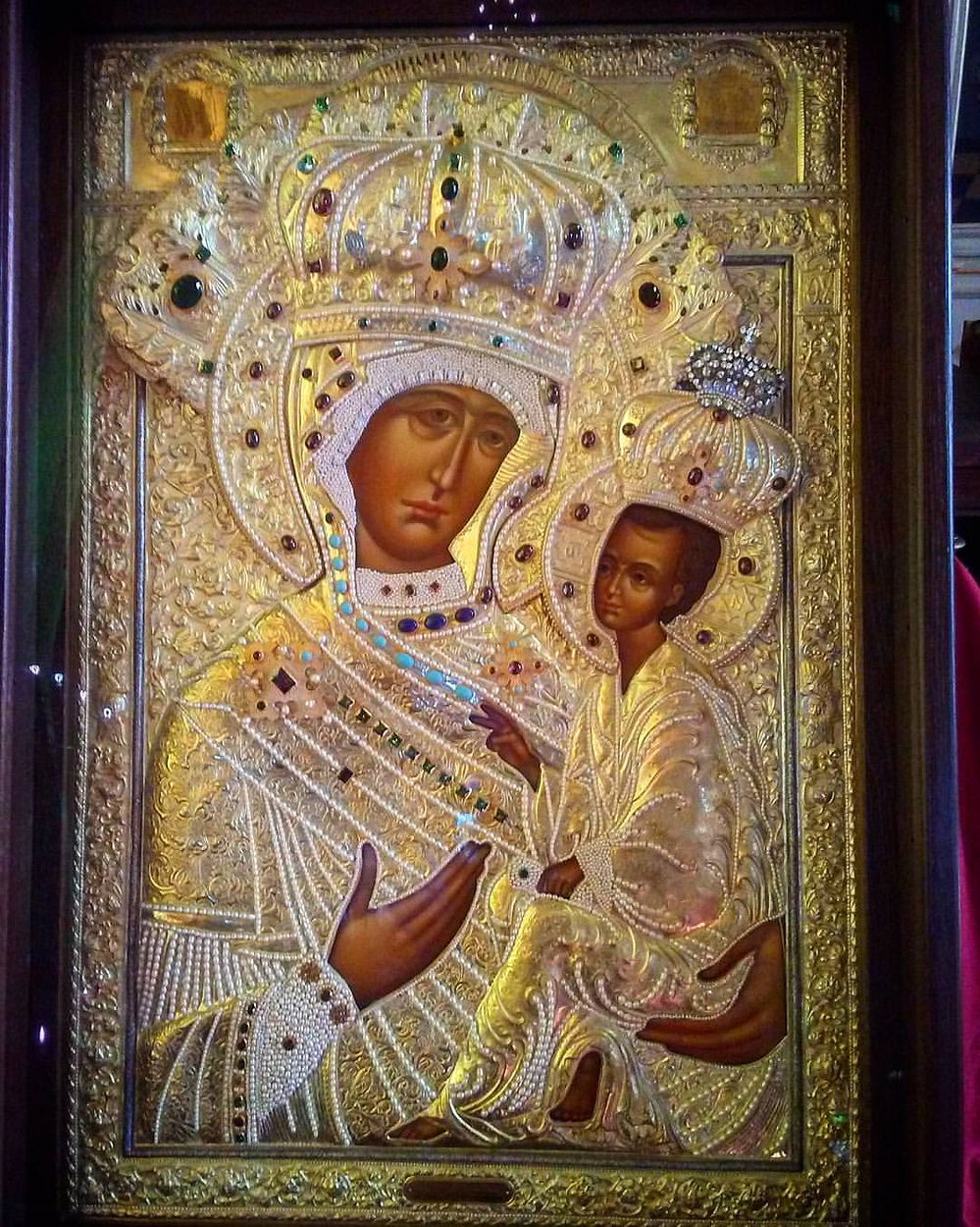 During the World War II German occupation, the Nazis removed the icon from the Tikhvin Monastery, from whence it was taken to Pskov and subsequently to Riga, Latvia. When Riga was evacuated, His Grace, Bishop John [Garklavs] of Riga — later Archbishop of Chicago and Minneapolis — in whose care the icon was placed, took the icon to Bavaria, where it was venerated by Orthodox faithful who had been displaced because of the war. While Soviet agents had spotted the icon, Bishop John was permitted to take the icon to the US in 1949, where it was venerated for many years at Chicago’s Holy Trinity Cathedral in Chicago. After Archbishop John’s repose in 1982, Archpriest Sergei Garklavs, his adopted son and Dean of Holy Trinity Cathedral, became the icon’s guardian. In July 2004, the icon was returned to Russia and once again enshrined in the Tikhvin Monastery.