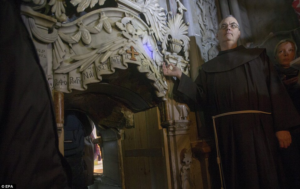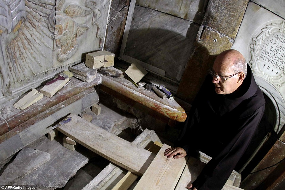 A Franciscan friar stands next to the tomb of Jesus Christ in the Church of the Holy Sepulchre in the old city of Jerusalem. The tomb has now been resealed and will probably not be opened again for hundreds, possibly even thousands, of years